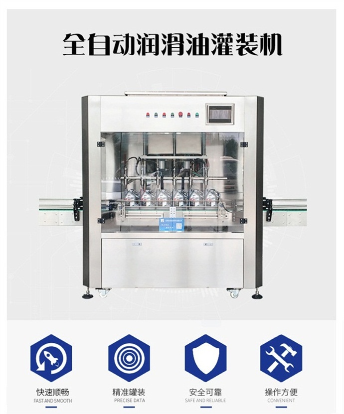 產品簡介: 本機是根據潤滑油的特性而設計的一款全自動稱重式潤滑油灌裝機,該機設計緊湊合理,外形簡潔美觀大氣,灌裝量調節方便,精度高,借鑒了歐美國家的先進灌裝流程控制技術,進口彩